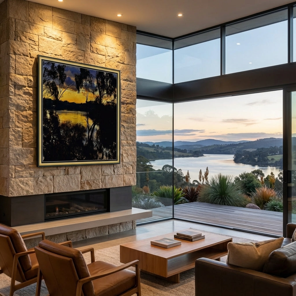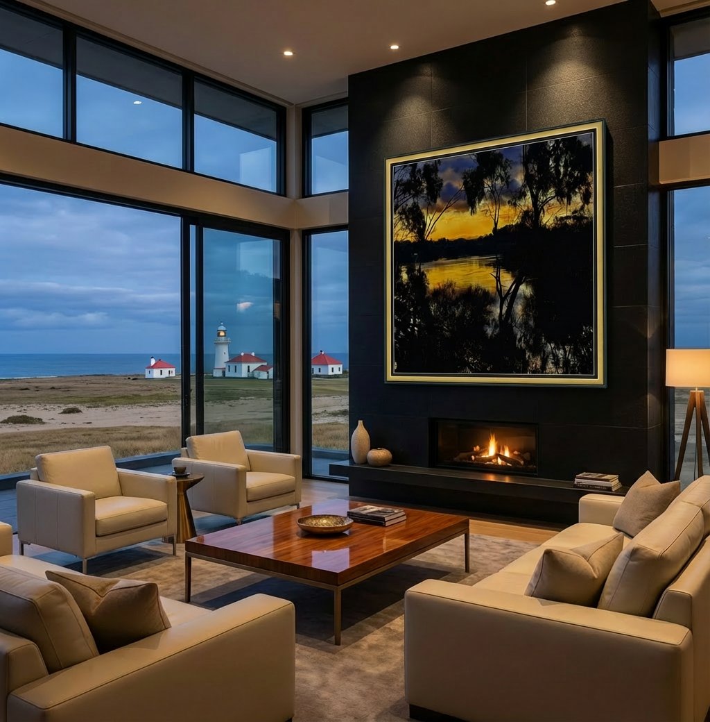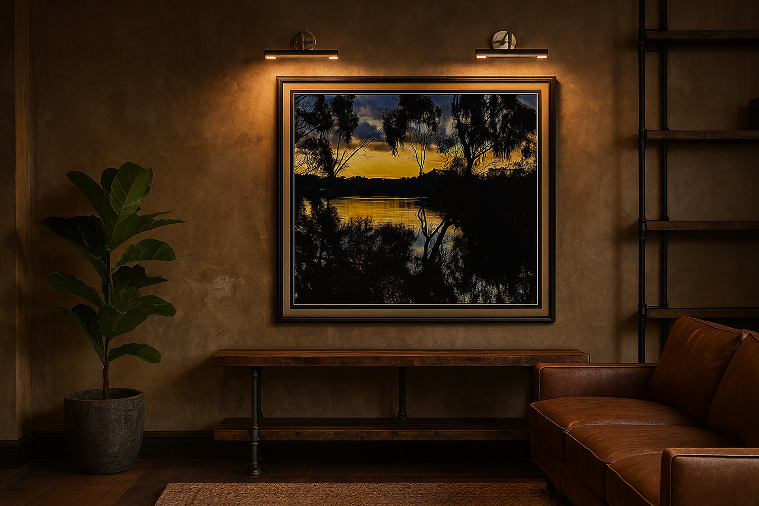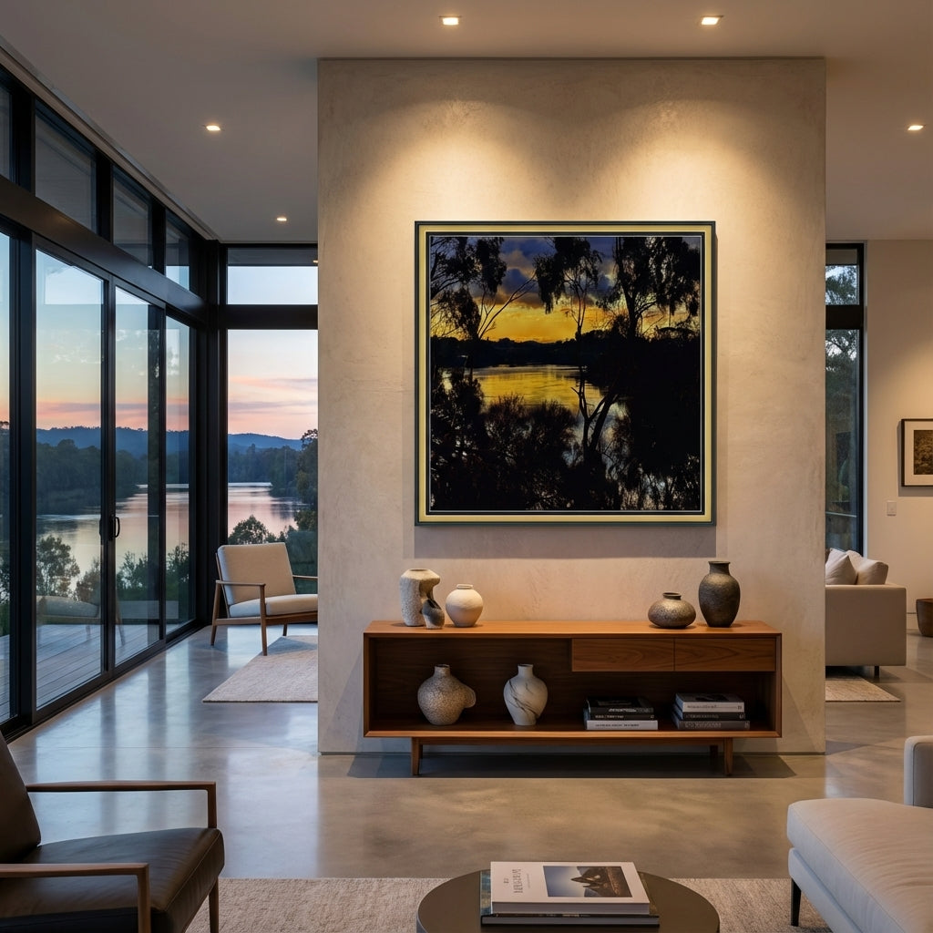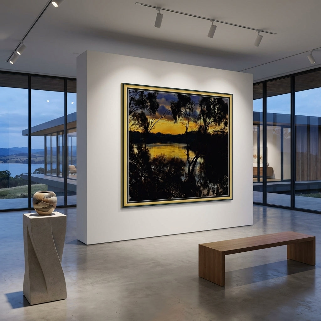 As golden light spills across the still water, silhouetted eucalypts frame this serene scene - their distinctive forms creating a natural gallery through which to witness the day's gentle closing. The sky transitions from deep twilight blues to radiant amber and gold, while the river below mirrors this luminous display, doubling the beauty of the fading light.