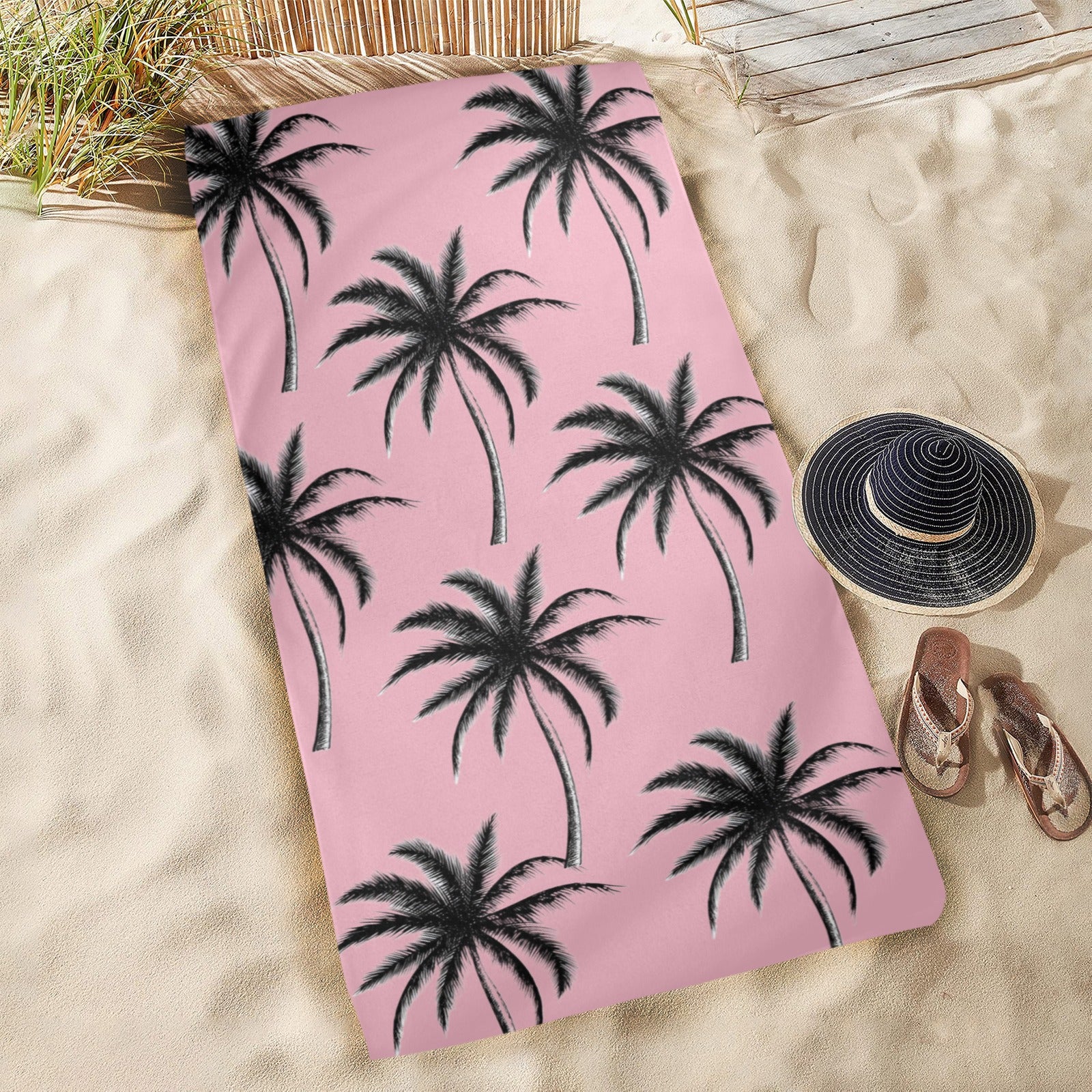 Embrace tropical paradise vibes with this chic beach towel featuring elegant black palm trees against a soft pink background. A sophisticated twist on classic beach style that's perfect for sun-seekers who love a touch of modern elegance!