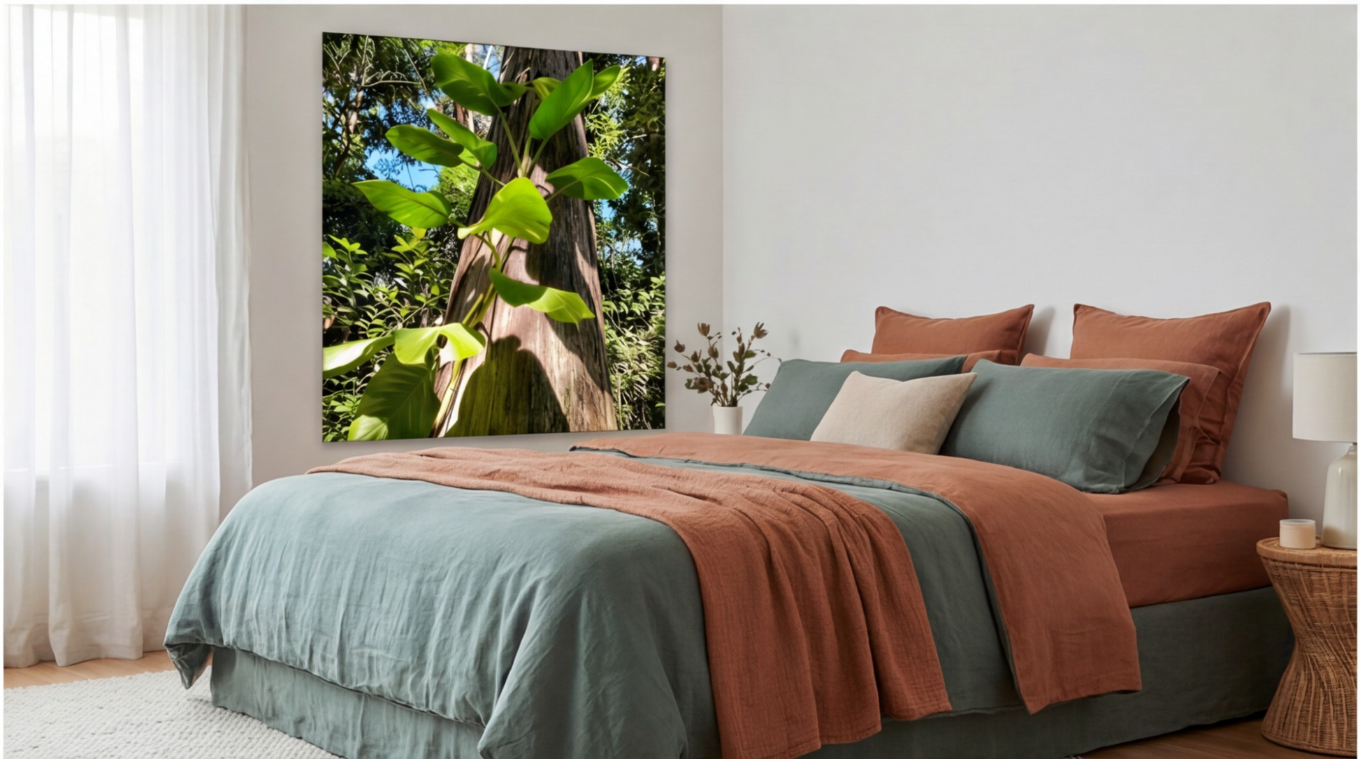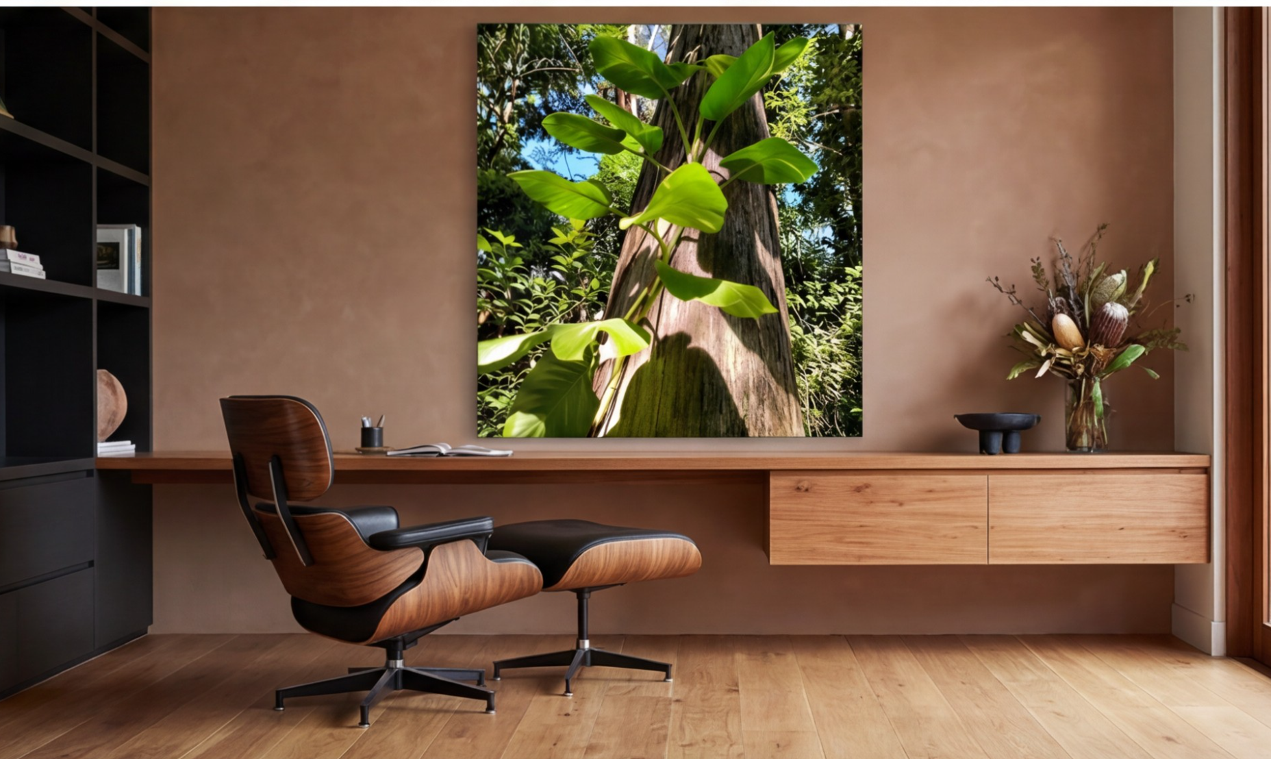 This is nature photography at its most commanding—a piece that doesn't merely hang on a wall but rather transforms the entire atmosphere of a room. The upward perspective evokes a primal sense of wonder, reminding us of the towering majesty of old-growth forests and our connection to the natural world.