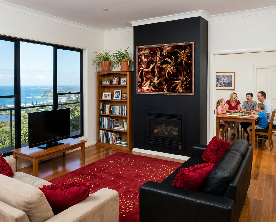 Through bold gestural strokes and rich, layered textures, this piece reveals the raw drama unfolding before us. Watch as crimson and gold Waratah blooms explode across the canvas—nature's triumphant declaration that beauty will not be silenced, no matter how fierce the storm.